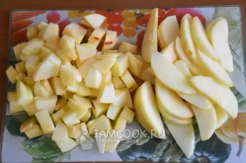 Первым делом нужно нарезать два яблока кубиками, а третье — тонкими дольками. Чтобы яблоки не потемнели, сбрызните их лимонным соком.