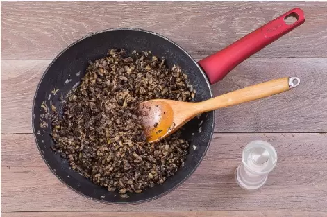 Шаг 1: Начать с разогрева духовки до 180°С. Лук следует очистить и нарезать мелкими кубиками, а также подготовить шампиньоны, обжаривая их с луком на 2 ст. ложках оливкового масла на сильном огне до золотистого цвета (в общей сложности 11 минут). Добавить немного муки, перемешать и переложить начинку в миску.