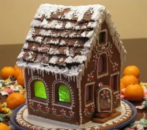 Перед выпечкой можно добавить цвет в окошки, посыпав карамелью. Она расплавится и подарит домику яркие акценты. После выпечки гладьте поверхности глазурью, чтобы придать блеск и завершенность, а затем давайте деталям полностью остыть на ровной подложке.