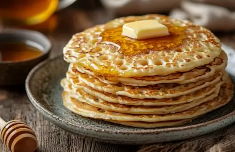 Для достижения необходимой воздушности теста, его следует оставить на время, чтобы оно поднялось. После этого блинчики жарят на сухой сковороде без масла — всего по одной минуте с каждой стороны. В результате получаются нежные лепешки, которые буквально тают во рту. Горячие блинчики можно смазать сливочным маслом, наполнив кухню ароматом детства и тепла.