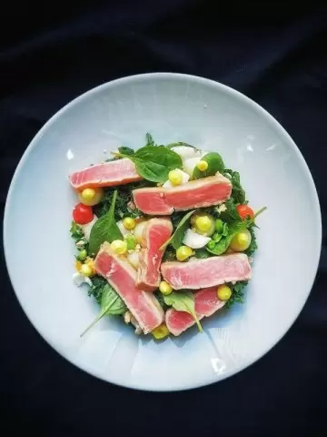 Для соуса вителло: смешать 175 г майонеза, 1 вареное яйцо, каперсы, анчоусы и консервированного тунца в блендере до консистенции однородности.Шафрановый айоли: выпарить 35 мл белого вина с шафраном в сотейнике, остудить и смешать с 100 г майонеза. Измельчить чеснок и добавить в соус, оставить на час для настойки.Салатные листья тщательно промыть, обсушить и порвать руками. Выложить на тарелки, нарезать вареные яйца и распределить поверх салата.Приготовить картофельные нуазетты, вырезая шарики из отварного картофеля.Обжарить филе тунца на раскалённой сковороде по 20 секунд с каждой стороны, дать остыть, затем нарезать полосками.Добавить капли шафранового айоли в салат, разместить кнели соуса вителло и уложить полоски тунца красной стороной вверх.