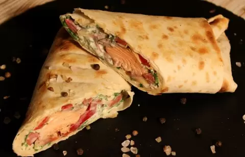 Для теста смешивают все ингредиенты, вымешивают, оставляют на полчаса для расстойки, а затем раскатывают. Лаваши обжариваются на сковороде до появления золотистой корочки. Что касается начинки, куриное мясо обжаривается, овощи нарезаются, а соус готовится из сметаны, лимонного сока и зелени. После наполнения лаваш аккуратно сворачивается и обжаривается с обеих сторон.