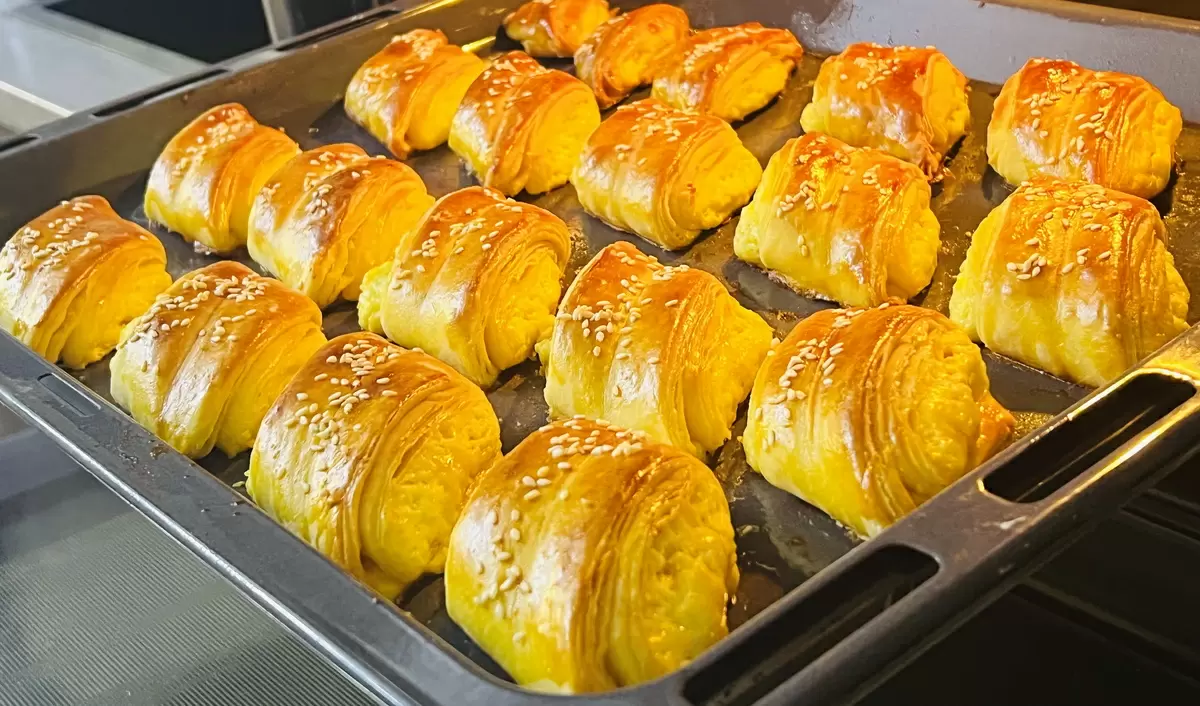Готовые рулеты нарезаем на порции и придаем форму, надавливая деревянной шпажкой для создания красивых узоров. Перекладываем на противень, заранее смазанный маслом, и смазываем верхнюю часть желтком. При желании можно посыпать кунжутом.
