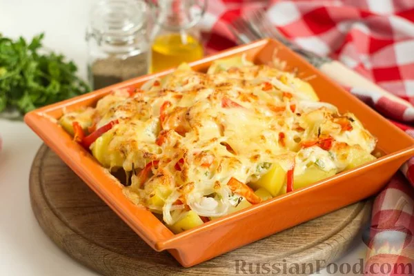 - В заливке с копчёным сыром: Блюдо из отварного картофеля под копчёным сыром, луком и сладким перцем порадует своим удивительным вкусом и ароматом. Такой вариант зарядит позитивом и разнообразит рацион.